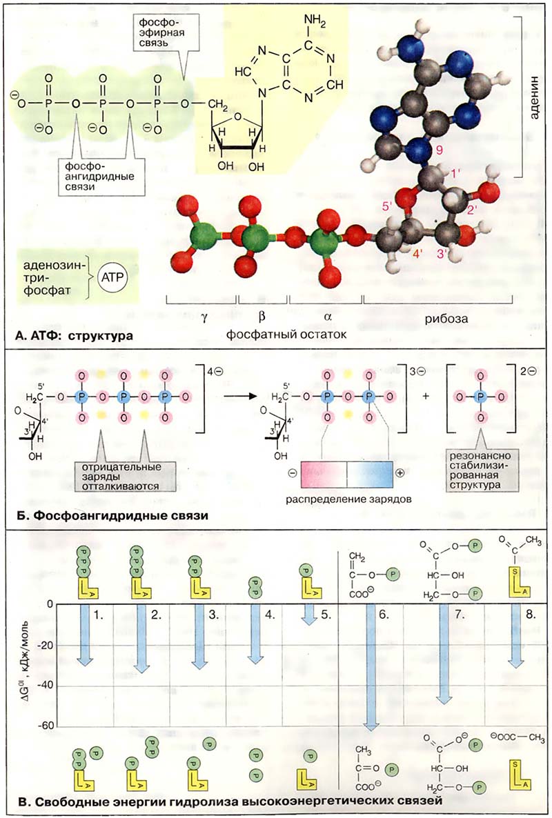 Изменение свободной энергии ΔG°′ (см. Углеводы) гидролиза фосфоангидридных связей в АТФ при pH 7 в стандартных условиях составляет от −30 до −35 кДж/моль. Независимо от того, какая из ангидридных связей АТФ при этом расщепляется, величина ΔG°′ остаётся практически постоянной (1-3). Даже расщепление пирофосфата (4) даёт в итоге более −30 кДж/моль, в то время как расщепление сложноэфирной связи между рибозой и фосфатом высвобождает только −9 кДж/моль (5).