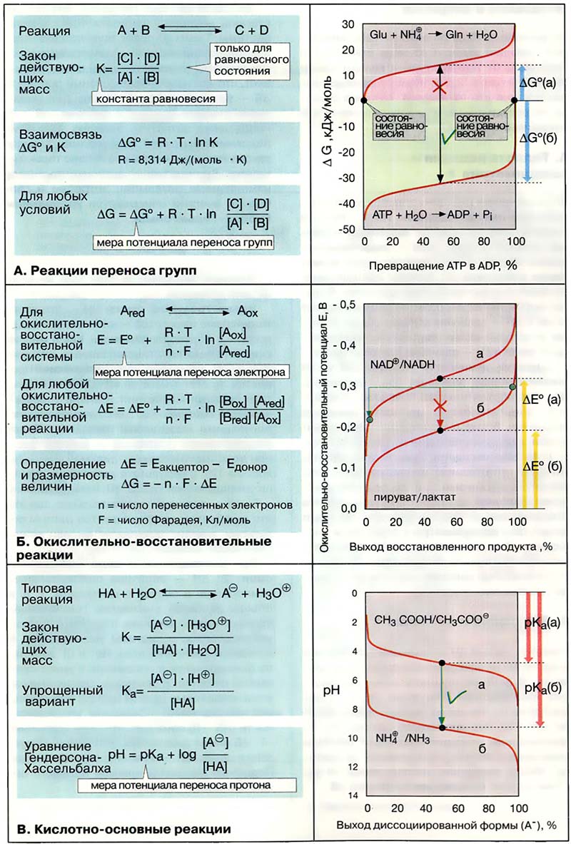 Каждая химическая реакция по истечении некоторого времени достигает состояния равновесия, при котором прямая и обратная реакции идут с равными скоростями. Соотношение концентраций исходных веществ (A, B) и конечных продуктов (C, D) в равновесном состоянии описываются законом действующих масс. Константа равновесия К непосредственно связана с изменением свободной энергии реакции в стандартных условиях ΔG° (ΔG° = -RTln К). Уравнение действительно для любых концентраций веществ. Если ΔG меньше 0, реакция протекает спонтанно до тех пор, пока не будет достигнуто равновесие (т. е. до ΔG° = 0). При ΔG больше 0 реакция не может протекать спонтанно (эндергонический процесс, см. Липиды). В биохимии ΔG обычно относят к pH 7 и обозначают как ΔG°’ или ΔG’.