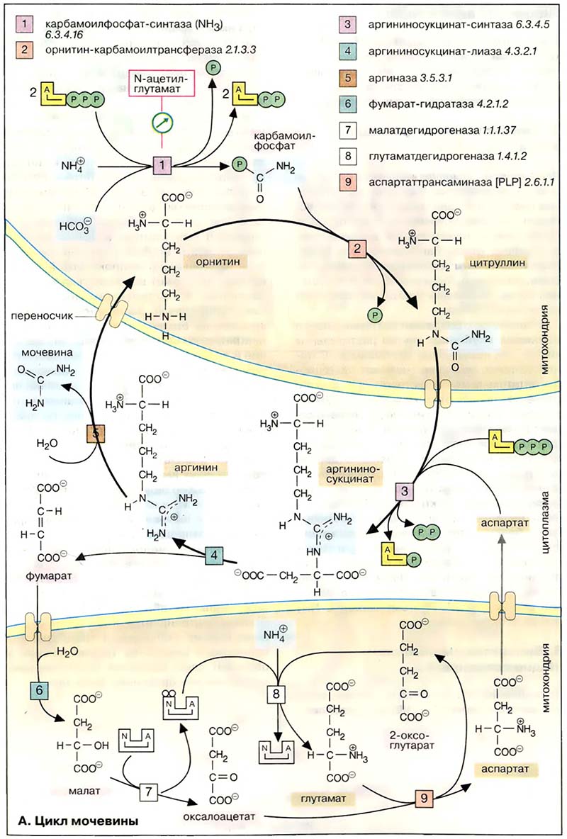 Фумарат, образующийся в цикле мочевины, может в результате двух стадий цитратного цикла [6, 7] через малат переходить в оксалоацетат, который за счёт трансаминирования [9] далее превращается в аспартат. Последний также вновь вовлекается в цикл мочевины.